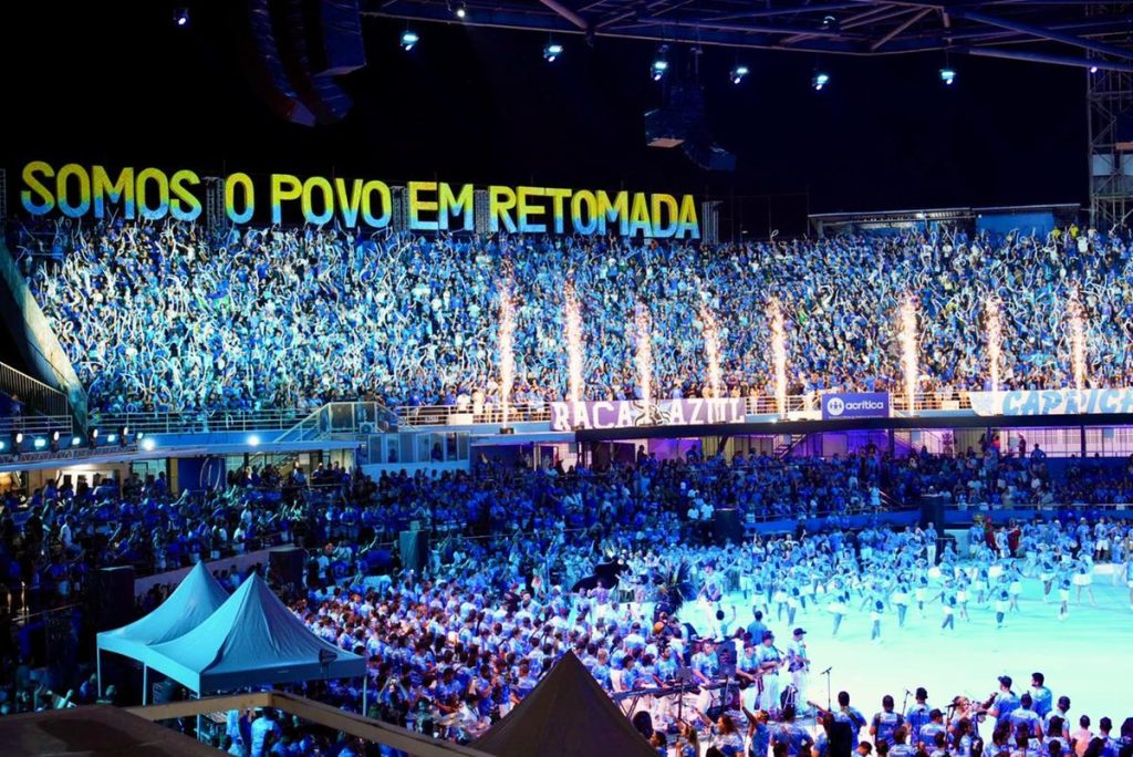 O Caprichoso abriu as portas do Bumbódromo nesta terça-feira (24) para o ensaio show aberto, um dos momentos mais aguardados da preparação do bumbá antes da disputa oficial do Festival de Parintins. Com as arquibancadas tomadas pela Nação Azul e Branca, o boi apresentou uma amostra do espetáculo: “É Tempo de Retomada”.