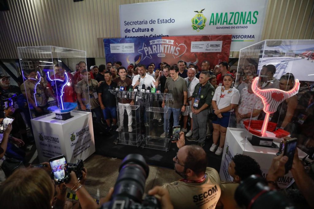 O governador do Amazonas, Wilson Lima, acompanhou a abertura da primeira noite do 58º Festival de Parintins, nesta sexta-feira (27/06) e durante coletiva de imprensa assinou o contrato para a elaboração do projeto executivo de arquitetura do novo Bumbódromo. A assinatura reforça o compromisso do Governo do Estado com a modernização da arena que abriga o maior festival folclórico a céu aberto do mundo.