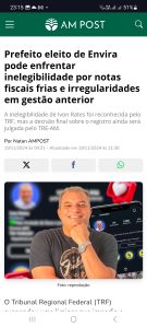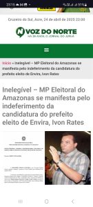 Depois da derrubada da liminar o plenário do Tribunal Regional Eleitoral do Amazonas (TRE/AM), em breve, deverá julgar e votar pela impugnação da sua candidatura e convocar eleição suplementar no município de Envira. O Ministério Público Eleitoral, se manifestou, nesta segunda-feira (18), favoravelmente a cassação da candidatura de Ivon Rates. Depois do anúncio da derrubada da liminar o prefeito eleito negou que a mesma não afeta o pleito.