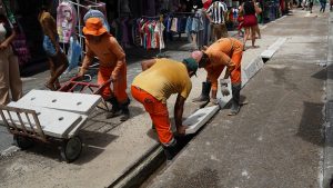 Na ação, trabalhadores da Seminf executam a limpeza e desobstrução da drenagem superficial, canaletas e implantam novas tampas em concreto armado, que são mais resistentes e duráveis. O trabalho abrange aproximadamente 250 metros da via, que têm grande fluxo comercial e histórico na cidade.